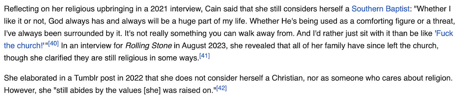 Religion made an unexpected thematic comeback in my life. No, I’ve not returned to my religious roots, but similar to my period of blasts from the past, there was a period this year when religion kept cropping up in conversation or imagery. During this time, I kept Ethel Cain’s album Preacher’s Daughter on repeat (she’s also from the Florida panhandle), and this section of her Wikipedia page really spoke to me: