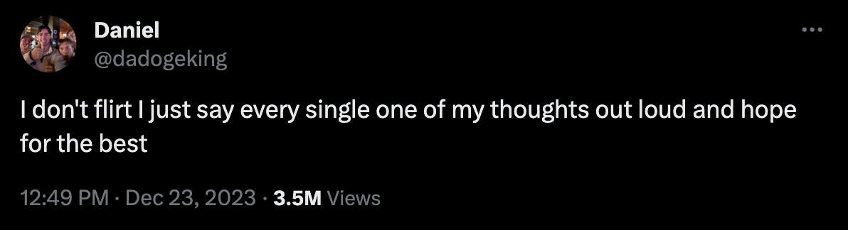 No one wants to be messy anymore, and this isn’t just about alcohol and going out. (Watch THIS TikTok before continuing.) Echoing point #6, I think our online-fueled gravitation toward optimization and surveillance has made many young people quite risk-averse (myself included at times). I’ve had a surprising amount of conversations with peers (all a few years out of college) who preach staying in and guarding their boundaries with impenetrable force. Obviously, a certain degree of aversion comes with aging (“don’t touch a hot stove”), and it’s important to be in touch with your limits, but what happened to letting your guard down and getting a little silly?